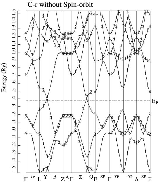 BN の構成原子をどちらも C で置き換えるとこの図のようなバンドになります。対称性が D3d となり、Σ軸もB軸も2回軸になって、図のように既約表現を、二つ持つようになります。結果として BN で開いていたフェルミエネルギーのところのギャップが図のように閉じてセミメタルに変わります。この図の