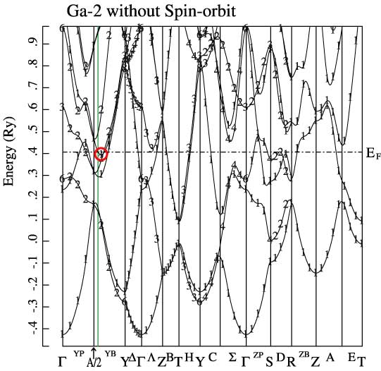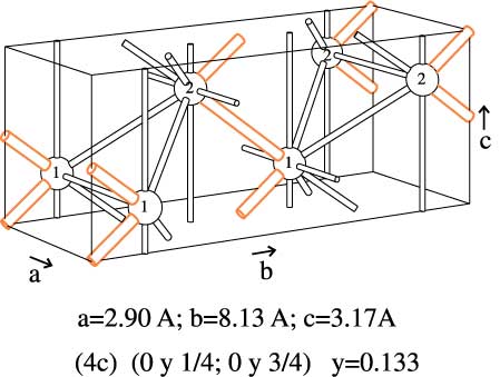 Gaの液体金属を -16.3℃に急冷すると、左図のような構造になると言われている。空間群は Cmcm で安定相と同じ 底心直方格子であるが b 軸がさらに長くなっている。